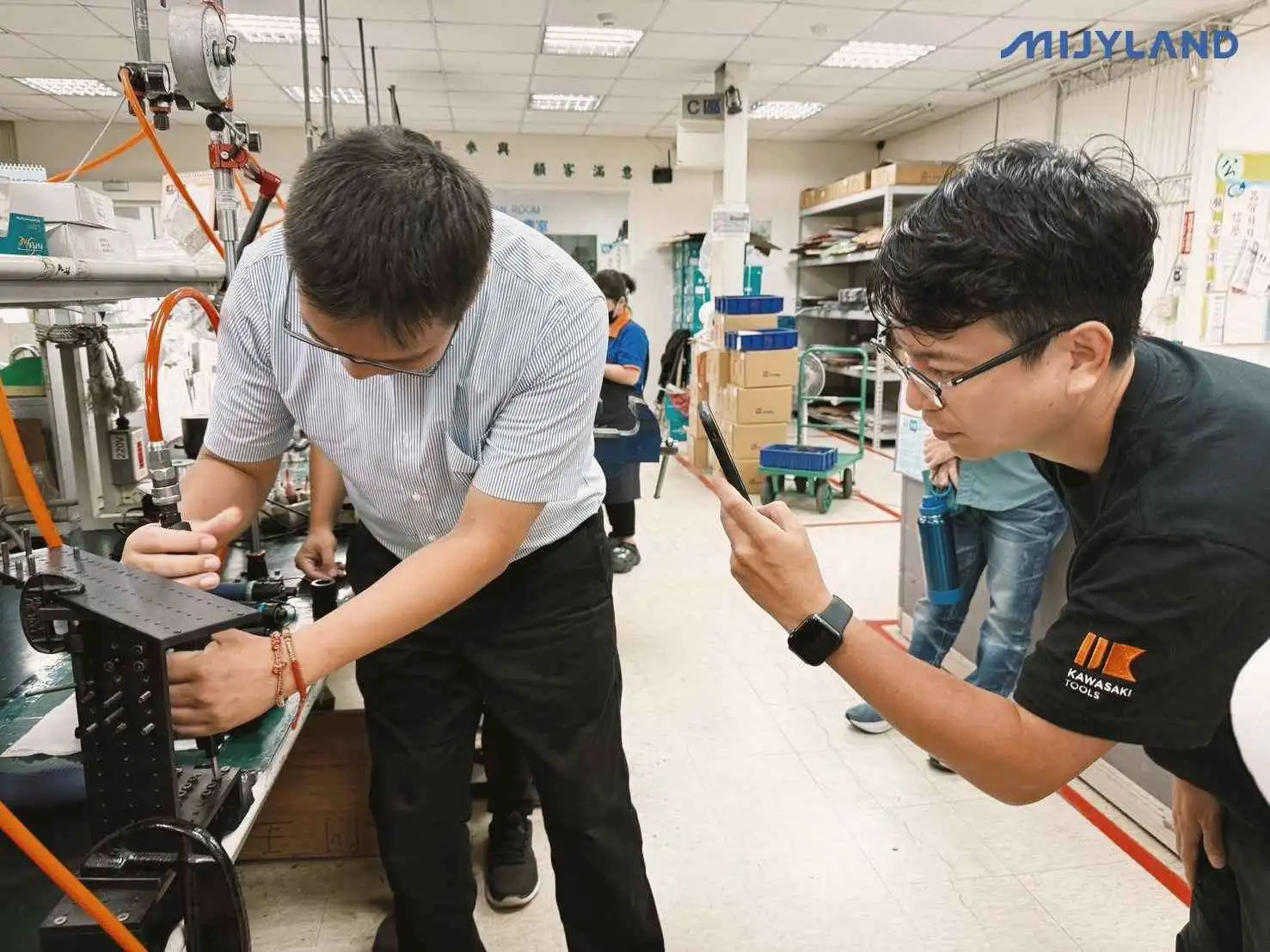 接待來自日本KAWASAKI TOOLS 及台灣貿易商TRAX 團隊蒞臨參訪。 KAWASAKI TOOLS 主要經銷半自動氣動工具,包含氣鑽、研磨機等產品。